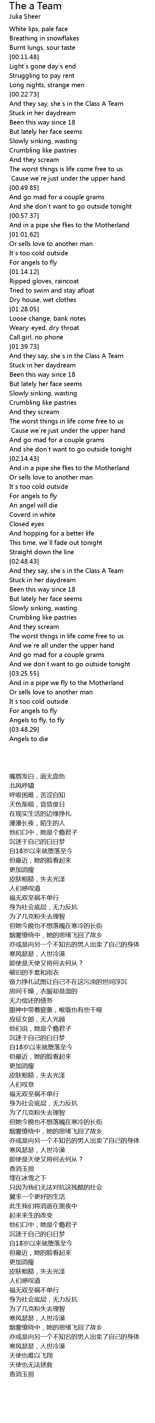 "Ed Sheeran - The A Team Lyrics", Ed Sheeran - The A Team Lyrics White lips, pale face Breathing in snowflakes Burnt lungs, sour taste Light's gone, day's end . "Ed Sheeran - The A Team (Spanish Lyric Video)", 2011 WMG The A Team (Spanish Lyric Video)..
