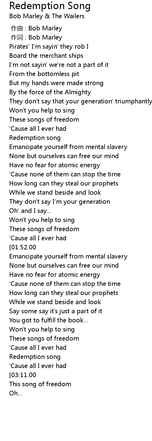 "Bob Marley Redemption Song + Lyrics", Bob Marley - Redemption Song + Lyrics.. This site is an open community for users to share their favorite pics on the internet, all pic or pictures in this blog are for personal images use only, it is stricly prohibited to use this images for commercial purposes, if you are the writer and find this images is shared without your permission, please kindly raise a DMCA report to Us.